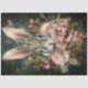 Detailed easter rabbit illustration, floral designs, artistic depiction, vibrant colors. Pink peach flowers, high detail, dark background, vivid contrast. Wildlife element, botanical theme, enchanting artwork, whimsical feel.