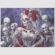 This captivating illustration features a dancing skeleton dressed in an elaborate ruffled dress adorned with vibrant red flowers. The dynamic pose of the skeleton adds a lively and whimsical touch to the macabre theme, creating a striking visual contrast. Perfect for celebrating Day of the Dead or adding a touch of gothic fantasy to any project, this enchanting artwork by RHDesigns of 2chattychicks captures the essence of elegance and mystery. Ideal for use with decoupage tissue paper, enhancing furniture, scrapbooking projects, canvas artwork, poster art, and home decor