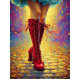 This dynamic and expressive artwork features a pair of red lace-up boots confidently striding along a cobblestone path. The wearer’s blue skirt, adorned with intricate lace detailing, sways with movement, suggesting purposeful motion or a whimsical walk through a storybook world. Surrounding the figure are swirling, abstract bursts of color—autumnal leaves, dreamy patterns, and a riot of warm tones that evoke both magic and momentum. The overall vibe is bold and spirited—like a visual anthem for independence, whimsy, and walking your own path.