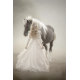 Bride with horse in soft mist, romantic moment for wedding crafts, lace gown and floral accents, serene scene for DIY décor, bridal theme with rustic charm, heartfelt design for keepsake gifts, nature-inspired paper for journal covers, elegant print for sentimental projects, morning light enhances wedding beauty, peaceful vibe for creative expression.