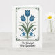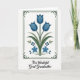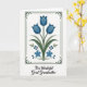 Designed with a tall, vertical layout, this card features a calm botanical illustration that feels like a quiet gift between close friends ❤️. Three large closed blossoms in deep blue stand at the center on slim stems, leaning slightly toward one another as if sharing a private moment. Around them, broad curved leaves in muted and olive greens fan outward, creating a gentle, protective cradle. Beneath the main flowers, two smaller open blooms in lighter blue add a soft contrast, tucked among clusters of dark blue berry-like dots for extra texture. A deep forest-green rectangular border frames the artwork, with ornate curled corner details that add a classic touch 🌼. At the bottom, a short Mother’s Day message appears in flowing cursive-style lettering, set in a dark green tone and centered just above the lower edge. The background stays bright white, making the cool blues and greens stand out clearly. The corners show small curling flourishes that mirror the leafy shapes inside the frame.