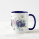 A lovely and graceful flowery print mug for coffee 'round the table. The enchanting band of flowers is of watercolor deep blue and purple hydrangea florets with delicate twining leaves, interspersed with two larger silver-pink roses and small tiny white roses around the rim and bottom.