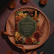 Rich, autumnal hues dominate this design, featuring deep burgundy and burnt orange blossoms reminiscent of dahlias and chrysanthemums. The textured floral arrangement creates a lush, bohemian feel. This piece evokes a sense of warm, rustic elegance.
