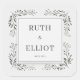 Infuse your wedding stationery with the crisp, organic clarity of this modern botanical arrangement. The design features delicate forest green sprig accents and deep emerald foliage that frame a central square, set against a beautifully textured white backdrop. A minimalist black line frame provides a sharp, sophisticated contrast, making the hand-painted watercolor greenery pop with a sense of natural refinement. Perfectly suited for a modern minimalist wedding, this versatile flourish serves as a high-end envelope seal for a formal invitation or a chic accent for monochrome favor boxes. Whether you are coordinating a formal RSVP response or personalizing your botanical wedding favors, this clean leaf detail ensures your presentation arrives with a hallmark of artistic simplicity and timeless organic grace.