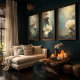 The moody teal, sage, and warm gold background envelops the figure in an atmosphere of quiet mystery, making this design a perfect centrepiece on furniture, frames, journals, or decorative wall panels. The flowing gown and dreamlike composition bring a romantic, fantastical quality that works beautifully in both contemporary and vintage-inspired interiors.
