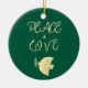 This Christmas photo ornament on a deep green background with a simplified peace dove and a peace and love message has a Christmas feel, a positive message and a rich elegant look. There is space for your own photo and the year on the front and on the back is the peace and love message and the simple dove graphic . The design is minimalist, modern, stylish and elegant.