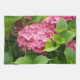 A beautiful setting of deep pink hydrangeas in full bloom nestled among their vibrant leaves and foliage.
