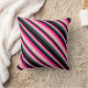 This throw pillow design features a pattern of stripes having colors like deep pink, light pink, dark slate gray, and black.