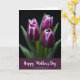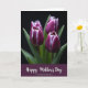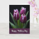Designed with four tightly closed blossoms near the top, this card features deep magenta and purple petals edged in thin white lines that feel like a gentle embrace ❤️. A dark, nearly black background makes the flowers stand out as if they’re leaning toward one another in quiet closeness. The lighting creates soft shadows and highlights that give each bloom a velvety look, adding a calm, romantic mood without showing any people. Green stems and leaves gather below, grounding the bouquet like a shared moment held steady. Across the lower portion, a wide plum-colored band stretches horizontally to frame the message area. Centered on that band is a flowing white message line, with the letters slightly slanted and easy to spot against the darker strip 🌼. The final look includes crisp white petal tips and a smooth plum base beneath the flowers.
