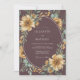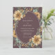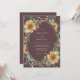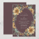 This design features a rich, deep plum background adorned with a lush arrangement of golden yellow roses and eucalyptus leaves. Delicate sprigs and floral accents create a romantic, autumnal feel. The overall impression is one of vintage elegance and natural beauty.