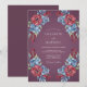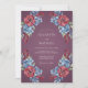 This design evokes a rich, romantic mood with deep plum hues and dramatic floral accents. Lush roses in shades of crimson and soft blue hydrangeas create an elegant, painterly display. Perfect for a sophisticated celebration.