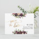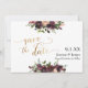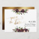 The top and bottom of this modern wedding-themed card have been decorated with small bouquets of watercolor flowers in hues of deep red, burgundy, Marsala, maroon, peach and blush pink. The key words "save the date" were rendered in a swirling, elegant script font and then embellished with a faux gold foil effect. All other text is editable and appears in a versatile, serif font you can change if you like. On the back I've placed a smooth faux gold foil ombre graphic. All layers were added separately and left unlocked to give you maximum design control; edit this look as much as you need to and don't hesitate to reach out to me if you need assistance with the process. // 56 //