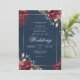 This design features rich, deep red floral accents against a sophisticated navy background. A delicate metallic border frames the composition, evoking a sense of opulent romance.