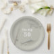 Party plates for the deep sea / saltwater fisherman turning 50, or any age. Customize the text in the center of tan-gray paper plates which are decorated with fish and a fishing pole / rod and reel.