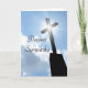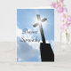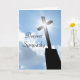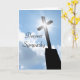 Original color photograph with a silhouette of a church cross with shining star effect standing bright against the blue sky and white clouds. "Deepest Sympathy" script is written on the front and "May the good memories bring you peace and comfort at this difficult time." is on the inside. Easily change the text or delete to hand write your message later. A beautiful and symbolic religious sympathy card.