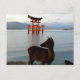 Postcard featuring photography of the big red torii on Miyajima Island, with a deer in the foreground.