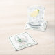 Christmas themed paper coasters, with a thin green border around the edge and beautiful watercolor graphics of a white deer and Christmas tree. Custom green text, on the bottom, can be personalized to read what you want.