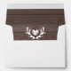 Deer antler wedding envelopes and wood grain liner. Rustic country chic design for wedding, bridal shower, engagement, anniversary etc. Faded distressed look vector art heart and antlers. Wild animal hunter / outdoor hunting theme. Brown barn wood grain panel background texture. Custom envelope color on the outside.