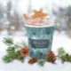 This paper cup design features a trendy pattern of deer head silhouettes with curving antlers, stylized arrows and tiny snowflakes in dark teal on a textured-effect, watchet blue background. Optional 'Happy Holidays' text and a label have been provided to add your name and/or other text. Search ID861 thru ID864 to see additional color options and other products in this modern, Christmas design set.