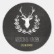 Chalkboard sticker with a deer drawn inside a wreath. With your names and wedding date. Perfect as an envelope seal.