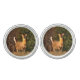 These cufflinks feature an early morning sunrise with a brown white-tailed deer (odocolleus virginianus) who has been sleeping at the foot of a green evergreen tree. The eyes, neck and tail are white. The forest is tinged with orange light.