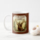 This rustic country mug is perfect for adding a personalized touch to your cabin, lodge or home that features nature / animal decor. On both sides, it shows a vintage image of a buck deer / reindeer with large antlers, recolored to add brightness and clarity, nestled between pine tree boughs. The background is made to look like a slightly-torn paper attached to a wood grain. Add your name to the template and it will customize on both sides. The word "cabin" can also be changed. See the matching set in our store under "Bar Sets / Matching Home Sets." These are perfect for an old west / rustic American look.