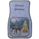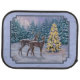 A whitetail buck and doe stand in a clearing surrounded by a forest of fir and pine trees, their branches heavy with snow. In the middle of the clearing is a Christmas tree decorated with warm holiday lights glowing through the snow to brighten the dark winter night. Realistic artwork created from an original oil painting by wildlife artist Crista S. Forest.
