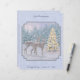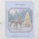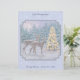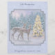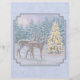 A whitetail buck and doe stand in a clearing surrounded by a forest of fir and pine trees, their branches heavy with snow. In the middle of the clearing is a Christmas tree decorated with warm holiday lights glowing through the snow to brighten the dark winter night. Realistic artwork created from an original oil painting by wildlife artist Crista S. Forest.