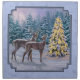 A whitetail buck and doe stand in a clearing surrounded by a forest of fir and pine trees, their branches heavy with snow. In the middle of the clearing is a Christmas tree decorated with warm holiday lights glowing through the snow to brighten the dark winter night. Realistic artwork created from an original oil painting by wildlife artist Crista S. Forest.