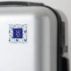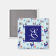 A magnet with a repeating pattern. Illustrated with a pair of blue scandinavian deer wearing red scarves. With decorative markings on their bodies. As well as a trio of red and blue christmas trees with a star on top. Fancy snowflakes sprinkled around. A square layered over top with your personalized monogram initial and name.