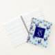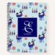 A sprial notebook with a repeating pattern. Illustrated with a pair of blue scandinavian deer wearing red scarves. With decorative markings on their bodies. As well as a trio of red and blue christmas trees with a star on top. Fancy snowflakes sprinkled around. A square layered over top with your personalized monogram initial and name.