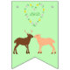 This awesome bunting features a male and female deer that look like a couple in love. The male deer (buck) is dark brown and has large antlers, the female deer (doe) is paler brown with white spots. There is a heart above the deer made of white daisy flowers and yellow buttercups.