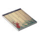 Personalized notepad with a rustic style. Designed with a deer head with antlers, made of red plaid. An image of wood planks with green ivy leaves for the background gives it an outdoorsy country feel. The top border has a dark blue pattern with sprigs and leaves.