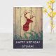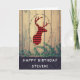 Happy Birthday greeting card with a rustic style. Designed with a deer head with antlers, made of red plaid. A fancy oval frame surrounds the image. Faux wood planks give it an outdoorsy country feel. Personalized message on the inside.