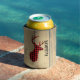 Personalized can cooler with a rustic style. Designed with a deer head with antlers, made of red plaid. An image of wood planks for the background gives it an outdoorsy country feel.