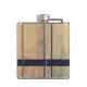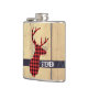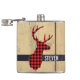 Personalized flask with a rustic style. Designed with a deer head with antlers, made of red plaid. . An image of wood planks for the background gives it an outdoorsy country feel.