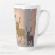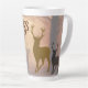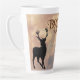 Deer hunter latte mug with name template. Woodland design with deer images and forest background wraps around this tall mug. Colors are brown, tan, gray and black with name in gray printed text on the design’s left side top. Makes a nice gift for a man who enjoys hunting.