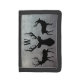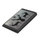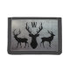 Mens wallet with hunting theme and single initial template. Distressed, gray metal design with three animal silhouettes with antlers. Makes a nice gift for the outdoorsman. Colors are black and gray, with option to change binding color.