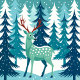 Illustration of a deer in a forest with a limited color palette, the deer is light green with white spots, it has red antlers, the forest is made of pine trees in different shades of blue and white, snow is falling.