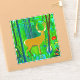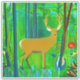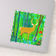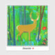 Sticker in a stylized illustration of a deer in a fairytale forest setting, surrounded by trees and plants, in shades of brown and green