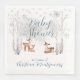 These custom baby shower napkins feature a cozy woodland winter theme. Little baby reindeer and a little white bird are resting between the trees in a forest. Pretty little snowflakes fall above the animals.