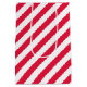 Big buck deer in holiday pine wreath and red berries on candy cane striped background.