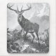 Beautiful black and white vintage illustration of deer in the high mountains. A male deer with antlers is followed by two other deer on the side of a mountain with mountains in the distance. circa 1890s Thiele