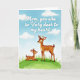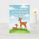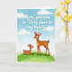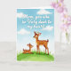 Designed with a gentle countryside scene, the front shows an adult deer standing on a rolling green hill beside a small fawn curled close, their bodies angled in a way that suggests a quiet, caring bond ❤️. Both have warm brown coats, and each is dotted with small heart-shaped markings that add a sweet, affectionate touch. The adult deer tilts its head slightly toward the fawn, as if keeping watch, while the fawn looks outward with wide, calm eyes. Behind them, a clear blue sky stretches across the top half, scattered with soft, rounded white clouds that keep the mood light and airy 🌼. Across the upper sky area, the message “Mom, you are so Very deer to my heart” appears in flowing, cursive-style lettering. The text is set large and easy to spot, with a darker color that stands out against the pale blue background. Soft greens in the grass and gentle shading in the deer keep the scene cozy and inviting. A few fluffy clouds float near the top edge above the lettering, with the hill’s curve rising toward the center beneath the pair.