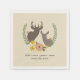 Paper napkins featuring an illustration of a buck and doe inside an orange floral wreath. Personalize the text. Look for matching invitations and other coordinating items at Jill's Paperie.