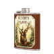 This rustic country custom flask design is perfect for anyone who loves animals / nature or hunting. It shows a vintage image of a buck deer / reindeer with large antlers, recolored to add brightness and clarity, nestled between pine tree boughs. The background is made to look like a slightly-torn paper attached to a wood grain. Add your name to the top to customize. The word "flask" can also be changed. See the matching set in our store under "Bar Sets / Matching Home Sets." These are perfect for an old west / rustic Americana / log cabin look.