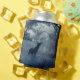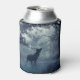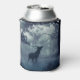 Can cooler with a photo of a regal deer with antlers standing in a shadowy forest among sunlit trees. Snow falling all around.