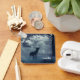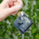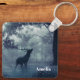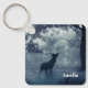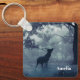 Keychain with a photo of a regal deer with antlers standing in a shadowy forest among sunlit trees. Snow falling all around.