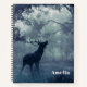 Spiral notebook with a photo of a regal deer with antlers standing in a shadowy forest among sunlit trees. Snow falling all around.