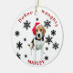 This adorable Beagle dog ornament captures the playful spirit of the holidays! Featuring a cute Beagle dog wearing a Santa hat, the ornament is adorned with delicate black snowflakes scattered across a crisp white background. The festive phrase "Define Naughty" is written in bold red text, adding a cheeky touch. Perfect for dog lovers, this ornament brings charm and humor to any Christmas tree while showcasing a beloved Beagle. Ideal for gifting or decorating, it’s a delightful way to celebrate the holiday season with your furry friend. Customizable front and back.